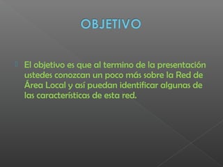 Este documento describe una red de área local (LAN), incluyendo que conecta computadoras en un área pequeña, opera dentro de un área geográfica limitada, y permite compartir recursos. Explica que una LAN puede conectar computadoras dentro de un edificio utilizando cables y que tiene topologías como anillo, bus y estrella. El objetivo es que los estudiantes conozcan más sobre las características de una LAN.