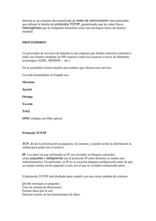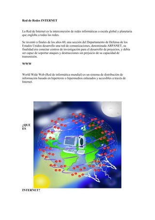 El documento describe la historia y el funcionamiento de Internet. Se originó en la década de 1960 como una red militar estadounidense llamada ARPANET que tenía la capacidad de soportar ataques. Más tarde evolucionó para incluir redes académicas y comerciales interconectadas a nivel mundial mediante protocolos como TCP/IP. El World Wide Web permite acceder e intercambiar información de forma hipertextual a través de páginas web y navegadores.