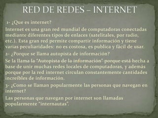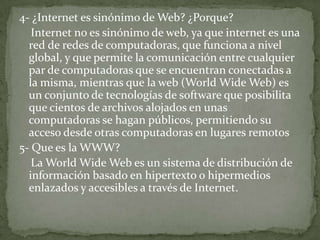 Internet es una red mundial de computadoras conectadas que permite compartir información de manera pública y fácil de usar. La World Wide Web es un sistema de distribución de información accesible a través de Internet que contiene páginas web interactivas con objetos multimedia. El correo electrónico permite enviar y recibir mensajes entre cuentas de correo que requieren una dirección de correo y proveedor de servicios.