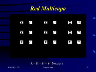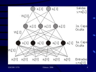 Este documento describe la arquitectura y el algoritmo de aprendizaje de las redes neuronales de retropropagación. Estas redes multicapas utilizan un método de aprendizaje supervisado llamado retropropagación del error para ajustar los pesos de las conexiones entre neuronas y minimizar el error entre la salida de la red y la salida deseada. El algoritmo consta de dos fases: propagación y retropropagación del error para actualizar los pesos y reducir progresivamente el error total de la red.