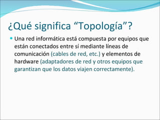 La topología física de una red informática se refiere a la configuración espacial de los equipos y cómo están conectados entre sí. Existen varios tipos de topologías como bus, estrella, anillo y árbol. En una topología de bus, todos los equipos están conectados a la misma línea de transmisión. En una topología de estrella, los equipos se conectan a un concentrador central. Una topología en anillo permite que los equipos se comuniquen por turnos a través de un distribuidor.