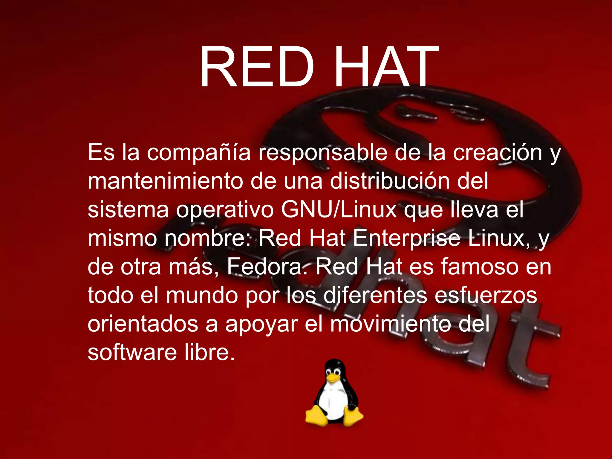 Red Hat es una compañía pionera en el desarrollo de software libre y distribuciones Linux. Crearon Red Hat Linux en 1994, y más tarde lanzaron versiones comerciales como Red Hat Enterprise Linux. Red Hat también mantiene la distribución comunitaria Fedora.