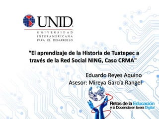Este documento describe un proyecto para enseñar la historia de Tuxtepec a través de la red social NING. Explica diferentes enfoques de la enseñanza de la historia y las tendencias ideológicas o políticas. Luego detalla cómo el aprendizaje de la historia puede beneficiarse de las tecnologías de la información a través de proyectos en Facebook, cursos MOOC y la red NING específicamente creada para este propósito llamada "historiadetuxtepec.ning.com". Finalmente, concluye resalt