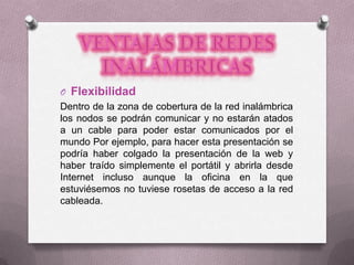 Las redes inalámbricas ofrecen flexibilidad ya que permiten la comunicación sin cables, lo que facilita la conexión en edificios donde no hay infraestructura de cableado. Sin embargo, tienen menor calidad de servicio y velocidad que las redes cableadas, y también plantean problemas de seguridad e interferencias debido al uso del espectro radioeléctrico.