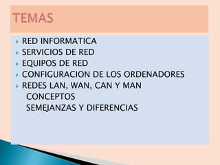 Este documento describe los conceptos básicos de las redes informáticas, incluyendo los tipos de redes LAN, CAN, MAN y WAN según su área de cobertura, los dispositivos y componentes de red como tarjetas de red, concentradores, repetidores, bridges y routers, y las ventajas de implementar una red dentro de una organización.