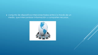 Una red informática es un conjunto de dispositivos interconectados que comparten información y recursos. Los dispositivos incluyen equipos de red como routers y switches, así como dispositivos de usuario final como computadoras y teléfonos. Existen diferentes tipos de redes definidas por su alcance geográfico, como PAN, LAN, WLAN, CAN, MAN y WAN. Las redes también pueden ser físicas o virtuales (VLAN).