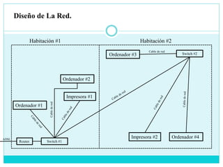 El documento describe el diseño e instalación de una red LAN doméstica que conecta dos habitaciones. La red consiste en un router, dos switches, cuatro ordenadores, dos impresoras y cables UTP categoría 5. Se explican los cinco pasos para instalar la red, incluyendo medir las distancias de los cables, unir los cables con conectores RJ45, conectar el router a la línea ADSL, conectar el router a los switches, y finalmente conectar los dispositivos a los switches.