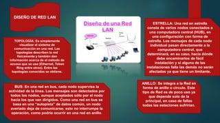El documento describe los conceptos básicos de una red local (LAN), incluyendo las topologías de red más comunes (bus, estrella, anillo), los requisitos para instalar una LAN y los pasos para configurar el protocolo TCP/IP. También discute los tipos de tarjetas de red, como las tarjetas Ethernet y las tarjetas inalámbricas USB, que se pueden usar para conectar equipos a una red o a Internet.
