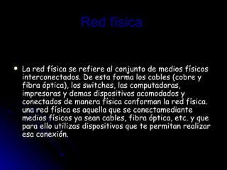 Una red local (LAN) es una red de computadoras y periféricos interconectados físicamente dentro de un edificio o un área de hasta 200 metros. Su propósito principal es permitir el intercambio de datos e información entre máquinas. Una red física se refiere a los medios físicos como cables y dispositivos que conectan las máquinas. Una red lógica se refiere a los protocolos y estructuras como estrella que permiten el funcionamiento de la red. Una intranet es una red privada interna de una empresa
