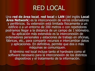 El documento describe los componentes principales de una red local, incluyendo servidores, estaciones de trabajo, tarjetas de red, medios de comunicación como cables, concentradores y puentes. Explica que una red local conecta computadoras y dispositivos dentro de un edificio o área limitada físicamente, mientras que una red extendida los conecta a distancias mayores incluso entre continentes. También define una intranet como una red privada dentro de una organización que usa tecnología de Internet de forma segura.