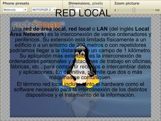 El documento describe los componentes principales de una red local, incluyendo servidores, estaciones de trabajo, tarjetas de red, medios de comunicación como cables, concentradores y puentes. Explica que una red local permite compartir recursos entre máquinas cercanas, generalmente dentro de un edificio, mientras que una red extendida conecta dispositivos a distancias mayores.