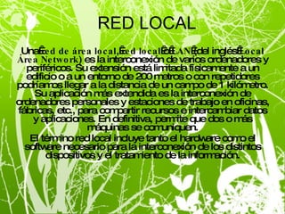Una red local (LAN) permite la interconexión de computadoras y periféricos dentro de un edificio o un área de 200 metros para compartir recursos e intercambiar datos. Los dispositivos necesarios incluyen servidores, estaciones de trabajo, tarjetas de red, cableado y concentradores. Las LANs pueden conectarse entre sí a través de puentes o expandirse geográficamente como redes extendidas.