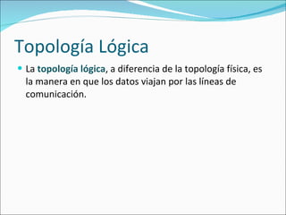 Este documento describe tres tipos comunes de topologías lógicas: Ethernet, que define características de cableado y formatos de tramas; red en anillo, donde los equipos se comunican por turnos a través de un distribuidor; y FDDI, que usa dos anillos de fibra óptica para permitir detección y corrección de errores a alta velocidad.
