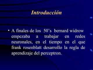 El documento resume los conceptos clave de las redes ADALINE (Adaptive Linear Neuron) y el algoritmo LMS (Least Mean Square). La red ADALINE es similar al perceptrón pero con una función de transferencia lineal en lugar de una función escalón. El algoritmo LMS minimiza el error cuadrático medio y es más poderoso que la regla de aprendizaje del perceptrón para resolver problemas linealmente separables.