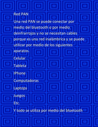 La red PAN permite la conexión inalámbrica entre dispositivos como celulares, tabletas, computadoras y juegos a través del Bluetooth sin necesidad de cables. Esta red personal se puede usar para compartir archivos y conectarse entre diferentes aparatos electrónicos de manera inalámbrica.