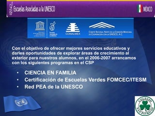 El documento describe el Colegio San Patricio, una escuela asociada a la Red PEA de la UNESCO. La Red PEA promueve una educación de calidad enfocada en la paz, la justicia y el desarrollo humano. El documento también explica los objetivos y proyectos de la Red PEA, incluyendo redes de escuelas asociadas en temas como la no violencia, la sustentabilidad y la ciudadanía juvenil.