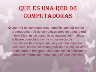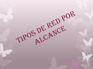 Este documento describe diferentes tipos de redes de computadoras, incluyendo redes de área personal inalámbricas, redes de área local, redes de área de campus, redes de área metropolitana, redes de área de almacenamiento y redes de área local virtual. Cada tipo de red se define brevemente y se especifica su alcance geográfico y propósito.