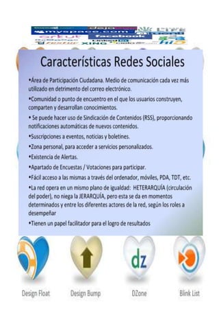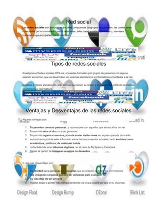 Las redes sociales son estructuras sociales compuestas de grupos de personas conectadas por relaciones como amistad o intereses comunes. Existen redes analógicas que no usan sistemas electrónicos y redes digitales que se desarrollan en línea. Algunas ventajas de las redes sociales son mantenerse en contacto con otros y organizar eventos de forma remota, mientras que las desventajas incluyen la pérdida de privacidad y el exceso de tiempo que se pasa en ellas. Las redes más populares actualmente son Facebook,