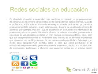 Este documento describe las redes sociales en la educación. Mantiene que las redes sociales permiten mantener contacto con un gran número de personas, lo que puede mejorar la comunicación entre profesores y alumnos. También facilitan la creación de grupos de trabajo y el compartir materiales digitales. Sin embargo, la dispersión de información entre múltiples recursos online puede dificultar la enseñanza, por lo que una única red social central puede ser ventajosa.