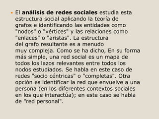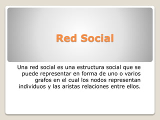Una red social es una estructura social que se puede representar mediante gráficos donde los nodos son individuos y las aristas son las relaciones entre ellos. El análisis de redes sociales estudia esta estructura aplicando la teoría de grafos. Las redes sociales tienen ventajas como romper el aislamiento y fomentar las relaciones, pero también desventajas como riesgos para la privacidad y seguridad. La historia de las redes sociales comenzó en la década de 1970 y ha evolucionado desde plataformas iniciales como BBS