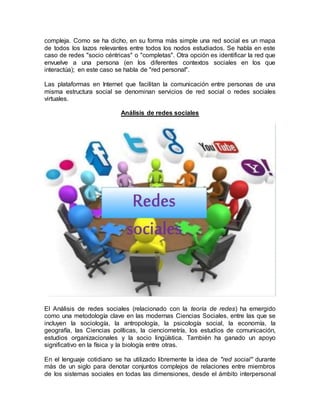Una red social es una estructura compuesta por individuos u organizaciones relacionadas entre sí. El análisis de redes sociales estudia estas estructuras aplicando la teoría de grafos para identificar los nodos (entidades) y las relaciones entre ellos. Esto permite analizar cómo la estructura de las relaciones afecta a los individuos y su capacidad de acceder a recursos e información.