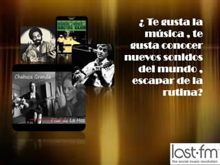 Este documento describe Last.fm, una red social especializada en música que ofrece radio en línea las 24 horas y permite a los usuarios descubrir nuevos artistas y géneros musicales de todo el mundo. Los usuarios pueden crear un perfil con sus gustos musicales, acceder a radios creadas por otros usuarios, compartir sus listas de canciones favoritas y recomendar conciertos. La red social también proporciona foros, conversaciones sobre música y herramientas para buscar artistas por década, país o estilo similar.