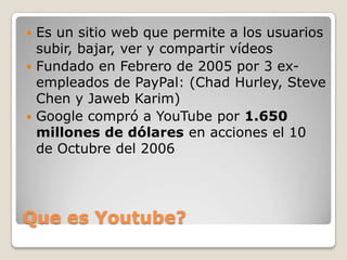 Este documento resume las características principales de YouTube. Fue fundado en 2005 por tres ex empleados de PayPal y fue adquirido por Google en 2006 por $1.65 mil millones. Aunque genera mucho tráfico, YouTube todavía no logra convertir ese tráfico en ganancias para Google. El documento también describe las APIs disponibles en YouTube que permiten integrar sus funciones en otros sitios web y aplicaciones.