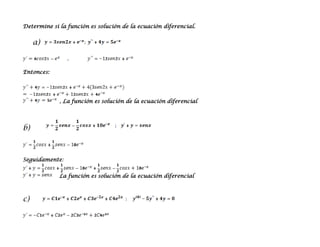 Este documento presenta una clase sobre ecuaciones diferenciales. Explica cómo determinar si una función es solución de una ecuación diferencial y resuelve varios tipos de ecuaciones diferenciales de primer y segundo orden usando métodos como integración, cambio de variable, factores integrantes y anuladores. El documento contiene ejemplos resueltos de cada tipo para ilustrar los conceptos y métodos.