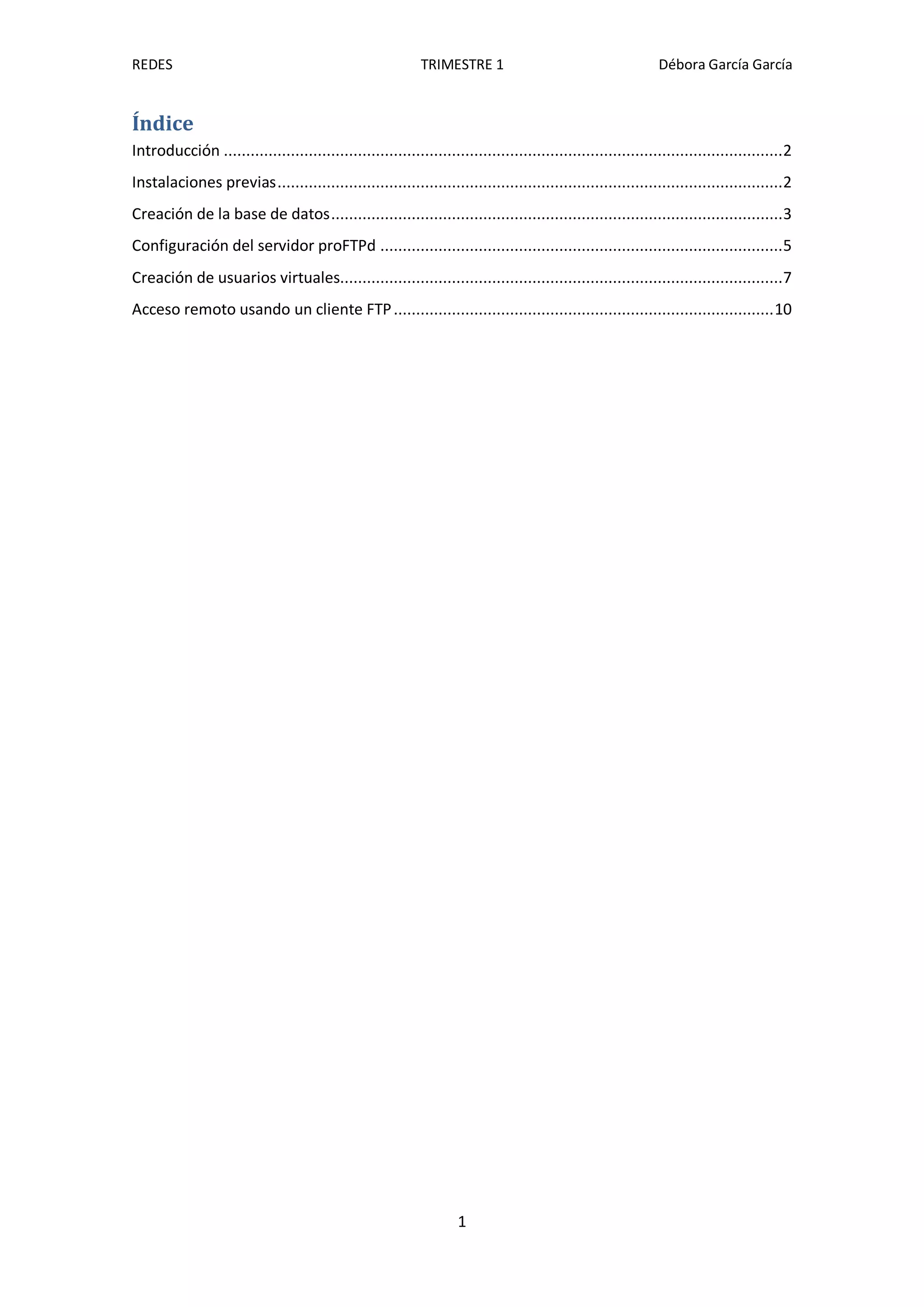 Este documento describe cómo configurar un servidor FTP para permitir el acceso a usuarios almacenados en una base de datos MySQL. Se instalan MySQL, proFTPd y los módulos necesarios. Se crean tablas en MySQL para almacenar información de usuarios y grupos. Luego, se configura proFTPd para autenticar usuarios contra la base de datos MySQL y se prueba el acceso FTP con dos usuarios creados.