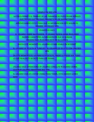 El documento explica cómo una red privada virtual (VPN) permite a los usuarios ocultar sus actividades en Internet al enrutar su tráfico a través de un túnel seguro. Describe el proceso de un usuario que abre su navegador, ingresa sus credenciales para acceder a su cuenta de correo electrónico, y luego se oculta detrás de una VPN, lo que mantiene su tráfico privado y no visible para otros hasta que abandona la sesión VPN y vuelve a estar visible en la red.