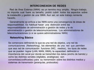 Este documento describe conceptos básicos de redes como LAN, WAN, ancho de banda y protocolos de comunicación. También explica los diferentes tipos de servicios WAN como T1, Frame Relay y ATM, así como métodos de conexión remota como módems y líneas dial-up. Finalmente, destaca la importancia de la administración y seguridad en redes WAN.
