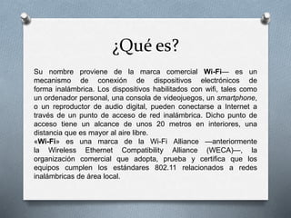 El wifi permite la conexión inalámbrica de dispositivos electrónicos a Internet a través de un punto de acceso. Funciona mediante estándares como 802.11b, 802.11g, 802.11n y 802.11ac en las bandas de 2.4 GHz y 5 GHz, ofreciendo ventajas como la movilidad pero también desventajas como menor velocidad y problemas de seguridad en comparación a las redes cableadas.