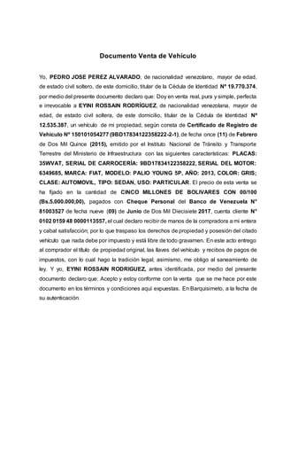 El documento trata sobre la venta de un vehículo y un inmueble entre Pedro José Pérez Alvarado y Eyini Rossain Rodríguez, detallando las características de ambos bienes y su precio de venta. Se incluyen requisitos legales para autenticar la venta tanto del vehículo como del inmueble ante notarías y registros públicos. El documento también resalta la entrega de títulos de propiedad y otros documentos necesarios para formalizar las transacciones.