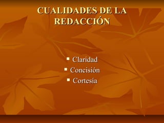 Este documento resume las cualidades fundamentales de una buena redacción: claridad, concisión y cortesía. Define la claridad como la capacidad de expresar las ideas de manera inteligible y precisa. La concisión consiste en expresar solo lo esencial sin detalles innecesarios. Y la cortesía crea buena voluntad entre el emisor y receptor a través del tono y formalidades.