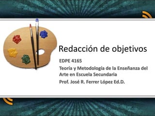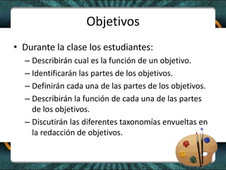El documento describe los objetivos de una clase sobre la redacción de objetivos educativos. Los estudiantes aprenderán sobre las funciones y partes de los objetivos, así como sobre taxonomías como las de Bloom y Krathwohl. Aprenderán a redactar objetivos observables, evitando errores comunes y maximizando la especificidad.