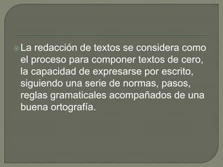 La redacción de textos implica componer escritos desde cero, siguiendo normas gramaticales y de ortografía, y requiere claridad en el tema, investigación previa y organización de ideas. El proceso incluye la elaboración de un borrador, revisión y correcciones, donde se resaltan aspectos como el estilo, la coherencia, la claridad y la cohesión. Se distinguen varios tipos de textos: narrativos, descriptivos, expositivos, argumentativos y digitales, cada uno con sus características y propósitos específicos.