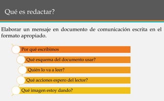 El documento habla sobre la redacción de informes técnicos y contables. Explica que la redacción es el proceso de plasmar información de manera coherente y con el lenguaje adecuado. También define qué son los informes técnicos y contables, sus características, estructura, elementos básicos y usuarios. Finalmente, detalla las normas y leyes que rigen la elaboración de informes contables.