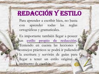 El documento habla sobre los diferentes tipos de redacción, incluyendo la redacción académica, periodística, administrativa, técnica y literaria. Describe cada tipo de redacción, dando ejemplos de cada una. También discute los diferentes géneros de la literatura, como la literatura infantil, juvenil y para adultos, así como los diferentes géneros literarios como la memoria, autobiografía, ensayo y crónica. El documento provee información sobre cómo escribir de manera efectiva según el propósito y el tipo de