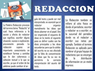 La redacción se refiere al proceso de escribir un texto de manera organizada y coherente. Implica planificar las ideas, definir las principales y secundarias, y escribir de forma clara, concisa y sencilla para que el mensaje sea entendido correctamente. La redacción es importante aun con las evoluciones tecnológicas para expresarse por escrito en redes sociales o blogs.