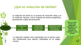 El documento aborda la redacción de textos, destacando su importancia en la comunicación efectiva y el proceso que implica la escritura, revisión y corrección. Se describen las características esenciales de un párrafo, así como los tipos de textos, incluyendo descriptivo, narrativo, expositivo y argumentativo. A su vez, se ofrece una guía para la elaboración de ensayos, enfatizando la necesidad de una estructura clara y el proceso de investigación y organización de ideas.
