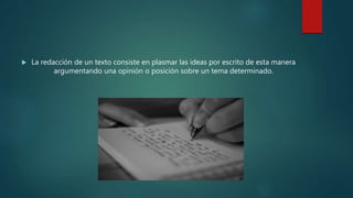 Este documento describe las etapas de la redacción de textos, que incluyen la planificación, redacción y corrección. También discute los elementos clave de un texto como el estilo, claridad, cohesión y coherencia. Finalmente, identifica diferentes tipos de textos como descriptivos, narrativos, expositivos, argumentativos y digitales.