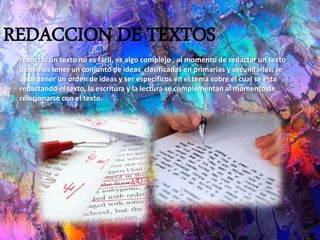 El documento habla sobre la redacción de textos. Explica que este proceso implica tres etapas: planificación, redacción y revisión. También describe las cualidades esenciales de un párrafo como unidad, cohesión y extensión, así como los tipos de párrafos. Por último, menciona que existen tres tipos de redacción de textos: argumentativo, descriptivo y expositivo.