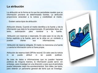 El documento habla sobre los conceptos de atribución, citas directas e indirectas, y recursos literarios en la redacción periodística. Explica que la atribución revela las fuentes de información y puede ser directa, con reservas, de reserva obligada o total. También describe las citas directas e indirectas de declaraciones y el uso de sinónimos, antónimos, adjetivos, adverbios, eufemismos y comillas.