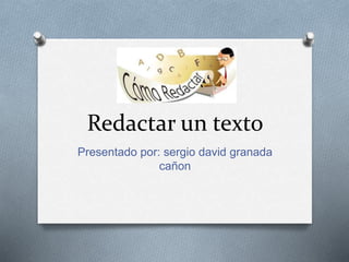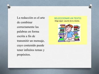 Este documento ofrece consejos sobre cómo redactar un texto de manera efectiva. Explica que la redacción es el arte de combinar palabras escritas para transmitir un mensaje, y que cada persona tiene su propio estilo único de redacción. Antes de comenzar a escribir, se recomienda reflexionar sobre las ideas principales y el tipo de texto, planificar el tiempo necesario, apuntar todas las ideas sin orden y seleccionar las palabras con cuidado para lograr claridad y sencillez.