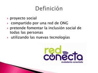 El documento describe Redconecta, una red de ONG que pretende fomentar la inclusión social de todas las personas utilizando las nuevas tecnologías. La red está formada por jóvenes, mujeres con dificultades de acceso al mercado laboral, desempleados de larga duración y personas con problemas de inserción social. Redconecta utiliza un enfoque comunitario y trabajo en red entre sectores para ofrecer formación y acompañamiento a través de las tecnologías.
