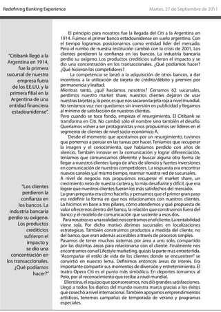 El documento detalla la transformación de Citi en Argentina tras la crisis de 2001, donde perdió la confianza de los clientes y tuvo que cerrar sucursales y adaptarse al nuevo entorno. Citi apostó por un resurgimiento a través de un enfoque centrado en el cliente, innovando en comunicación y ofreciendo productos personalizados, logrando así una recuperación significativa de su satisfacción y market share. Hoy en día, Citi destaca por su alto índice de satisfacción del cliente de 8.3, simbolizando su éxito en redefinir la relación bancaria con un enfoque de lifestyle marketing.