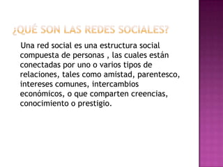 Las redes sociales son estructuras sociales compuestas de personas conectadas por relaciones como amistad o intereses comunes. Se originaron en 1995 cuando Internet permitió que personas mantuvieran contacto con antiguos amigos. El pionero Randy Conrads creó el sitio Classmates para que la gente se conectara. Las redes sociales son otra forma de comunicación como hablar o reunirse con amigos, pero a través de Internet.