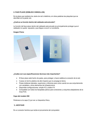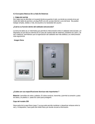 Este documento describe los componentes básicos de una sala de sistemas, incluyendo tomas de datos, faceplates, jacks RJ45, tomas de corriente, canaletas, cables de parcheo, cableado permanente, plugs RJ45, patch panels y switches. Cada componente cumple una función específica en la distribución y conexión de la red, y pertenece a la capa física del modelo OSI.