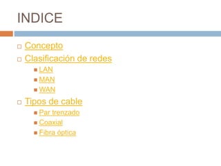 Este documento resume conceptos clave sobre redes de computadoras. Explica que una red es un conjunto de equipos conectados que comparten información. Luego clasifica las redes en LAN (redes locales), MAN (redes metropolitanas) y WAN (redes mundiales). Finalmente, describe los tres tipos principales de cables de red: par trenzado, coaxial y fibra óptica.