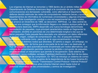 El documento describe los orígenes de Internet y la red ARPAnet en 1969 como una red experimental del Departamento de Defensa de EE.UU. para compartir recursos entre universidades y empresas. Introdujo la tecnología de conmutación de paquetes que fragmenta la información en paquetes enviados de forma independiente a través de rutas alternativas para garantizar la entrega en caso de fallos en la red.